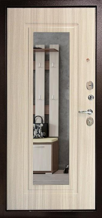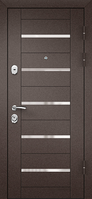 Прочный стальной каркас, лист металла толщиной 2 мм и система блокираторов делают эту модель надежным барьером для квартиры, офиса или частного дома. Внешняя поверхность покрыта молотковым напылением, устойчивым к механическим повреждениям и перепадам температуры, благодаря чему дверь сохраняет аккуратный вид долгие годы. Внутренняя накладка МДФ добавляет уюта и гармонично сочетается с интерьером прихожей. Зеркало на полотне выполняет не только декоративную функцию, но и делает пространство визуально шире. Зеленая входная дверь в квартиру №2 комплектуется двумя замками российских производителей — сувальдным Просам и цилиндровым Мосрентген, каждый из которых оснащён тремя ригелями. Два контура резинового уплотнения помогают минимизировать сквозняки и шум, а возможность выбрать сторону и тип открывания делает установку максимально удобной. При необходимости отделку, замки и дополнительные элементы можно адаптировать под индивидуальные требования. Зеленая входная дверь в квартиру №2 от производителя: быстрое изготовление и монтаж в Малоярославце, индивидуальные размеры, широкий выбор материалов и фурнитуры, официальная гарантия до 10 лет.