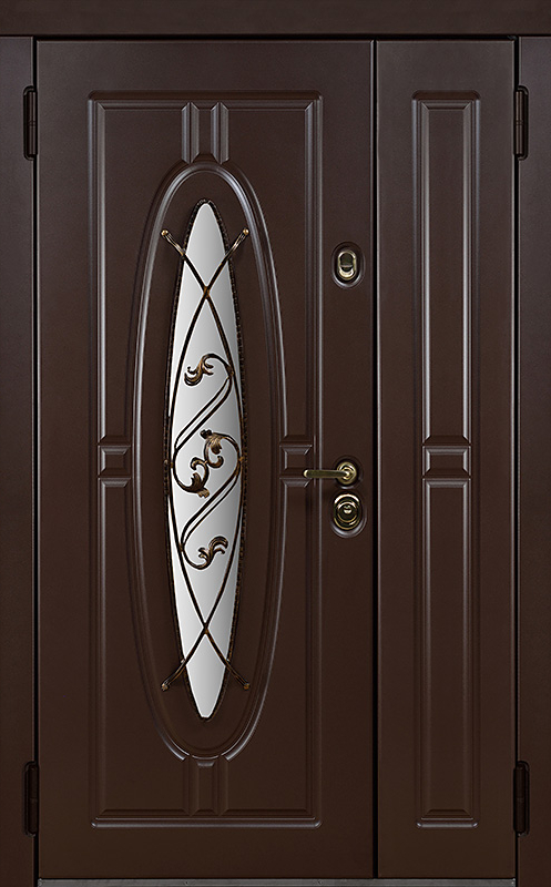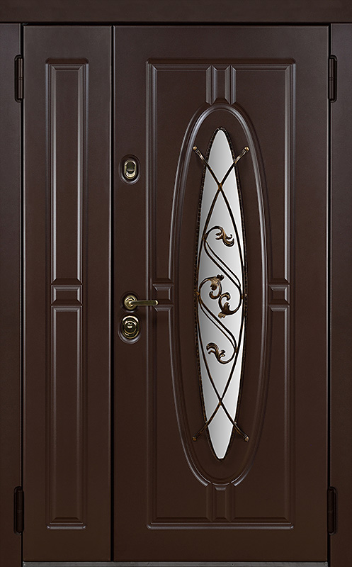 Двойная уличная дверь с овальным стеклом и художественной ковкой №14 — это уникальное сочетание функциональности и эстетики. Панели МДФ с ПВХ-покрытием, используемые как для внешней, так и для внутренней отделки, обладают высокой стойкостью к внешним воздействиям, сохраняя свой внешний вид на долгие годы. Внешний декор в виде художественной ковки придаёт двери особый шарм, подчеркивая её стиль и индивидуальность. Двойная уличная дверь с овальным стеклом и художественной ковкой №14 от производителя: быстрое изготовление и монтаж в Малоярославце, индивидуальные размеры, широкий выбор материалов и фурнитуры, официальная гарантия до 10 лет.