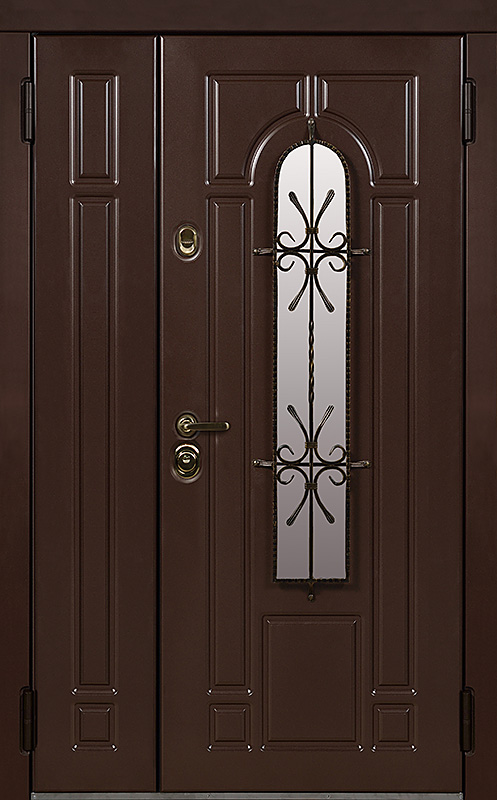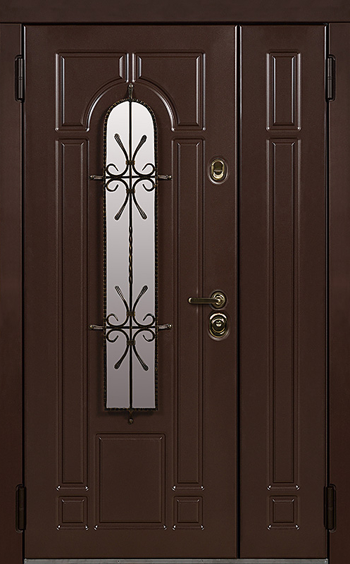 Эта металлическая двухстворчатая дверь с арочным стеклопакетом №15 представляет собой идеальный баланс между эстетикой и прочностью. Арочное стекло добавляет в её дизайн утончённость, а ковка в декоре придаёт изысканный, но в то же время крепкий и надёжный вид. Плита МДФ, используемая как для внешней, так и для внутренней отделки, не только сохраняет прекрасный внешний вид, но и устойчива к механическим повреждениям. Металлическая двухстворчатая дверь с арочным стеклопакетом №15 от производителя: быстрое изготовление и монтаж в Малоярославце, индивидуальные размеры, широкий выбор материалов и фурнитуры, официальная гарантия до 10 лет.