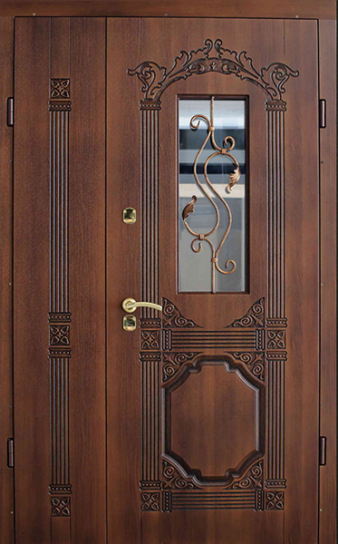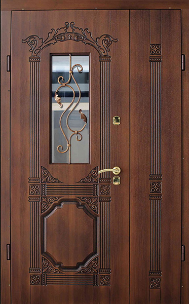 Уличная двухстворчатая дверь со стеклом и кованой решеткой №26 — это не только надежная защита для вашего дома, но и элемент, который подчеркнет его стиль и индивидуальность. Внешняя отделка из МДФ с ПВХ обеспечивает долговечность, устойчивость к внешним воздействиям и сохранение эстетического вида на долгое время. Добавление кованой решетки и стеклопакета придает двери элегантности, а также улучшает светопропускание, создавая комфортное освещение в вашем помещении. Уличная двухстворчатая дверь со стеклом и кованой решеткой №26 от производителя: быстрое изготовление и монтаж в Малоярославце, индивидуальные размеры, широкий выбор материалов и фурнитуры, официальная гарантия до 10 лет.